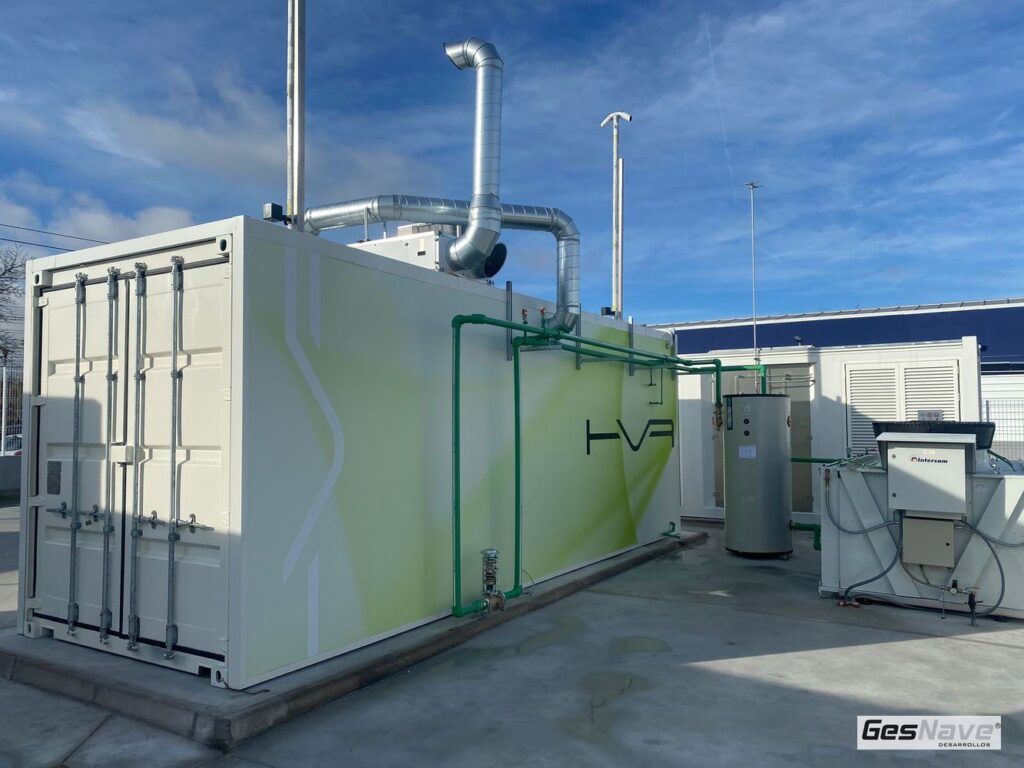 El hidrógeno a baja presión (30 bar) pasa entonces al módulo de compresión y suministro, donde será comprimido a alta presión (500 bar) y, posteriormente, almacenado hasta ser dispensado para la recarga del vehículo.